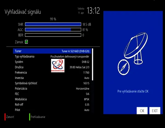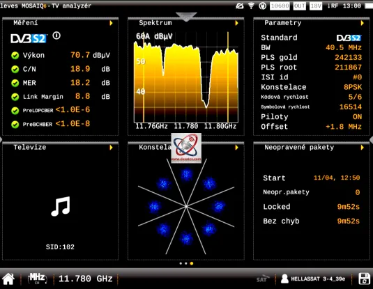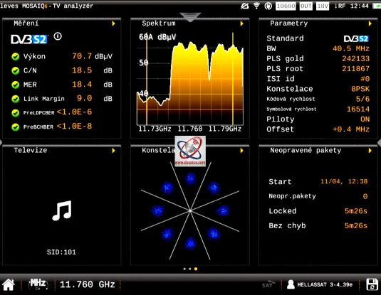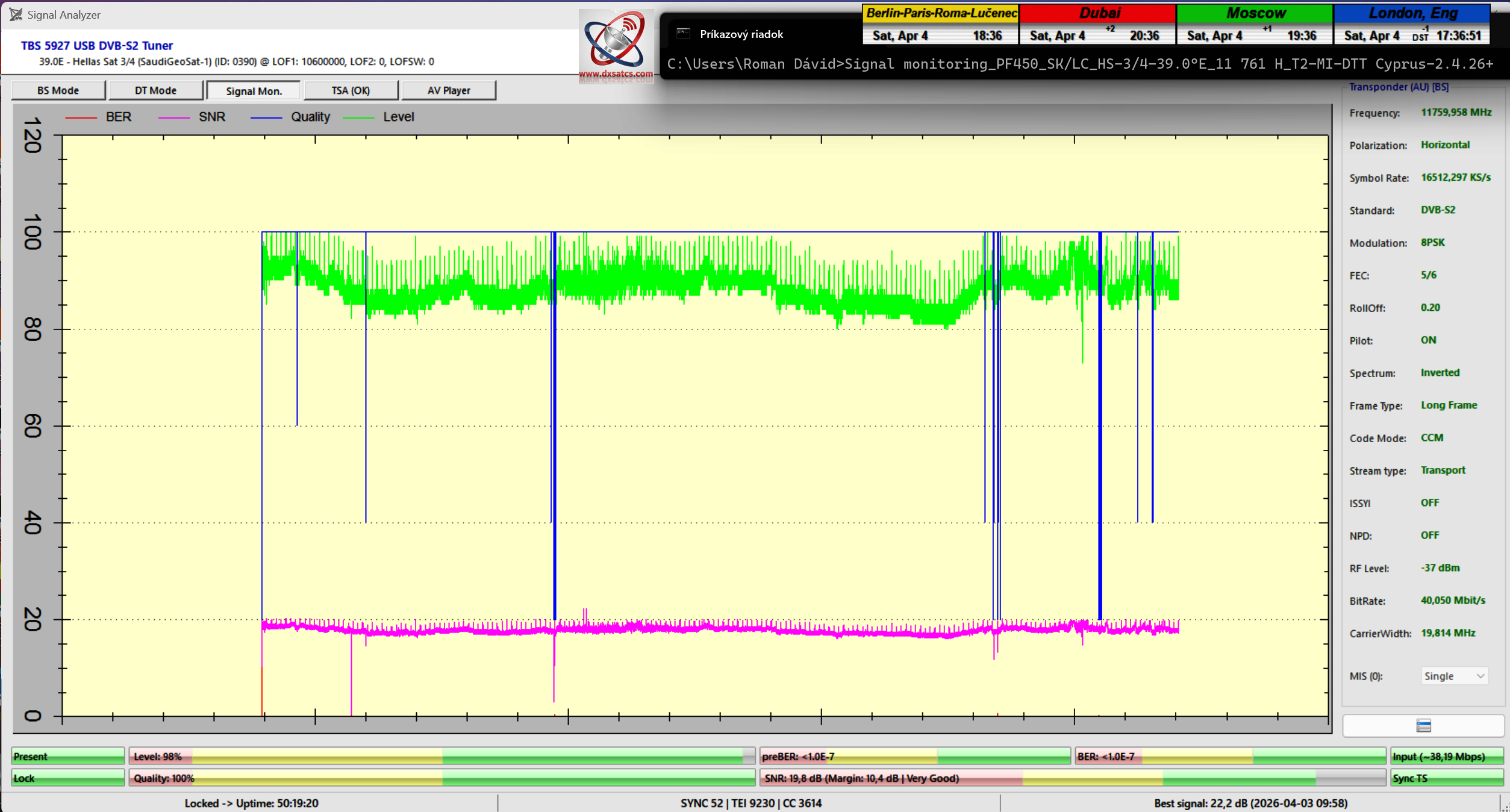 ENG_The result of the first official signal monitoring on the T2-MI carrier frequency f = 11,779 MHz_H demonstrates the following condition: two-second lock dropouts, immediately followed by a continuous reception (no permanent carrier lock loss), and approximately 20 seconds of reception with micro-pixelation during the monitoring interval of t = 60+ hours verify a reception stability of 99.9%, despite the occurrence of strong gusty winds with speeds of 8–14 m/s on 6 April 2026 in my geographical area, according to measurement data from SHMÚ.