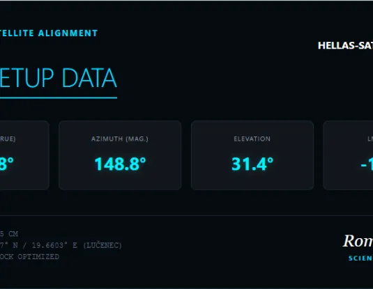 For the Ku band and in-footprint reception, the ideal reflector diameter for Central Europe is therefore 100–120 cm, which allows achieving reception stability at a level of 97–99% of the time. Such a system also provides sufficient signal margin even during moderate rainfall, unlike systems with a minimum diameter where the margin drops to near-zero levels.