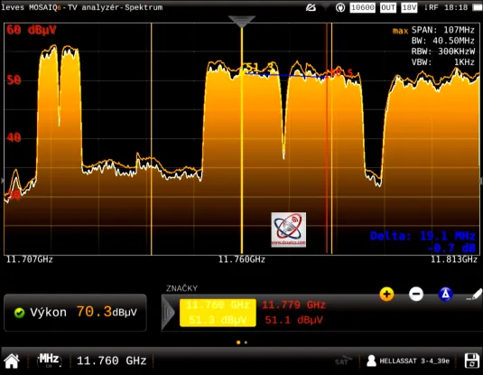 The measurement location — the city of Lučenec — is, like all of Central Europe, located in the beam peak zone of the given satellite with a power intensity of 53 to 54 dBW. From the perspective of power intensity, this practically allows every satellite dish owner, starting from the smallest reflector diameter of an offset-type antenna (80–90 cm), to tune in and receive the T2-MI standard from the Hellas Sat 4 satellite in UHD-4K/HD/SD resolution across approximately 99% of the territory of the European continent.