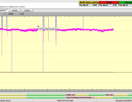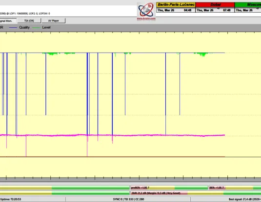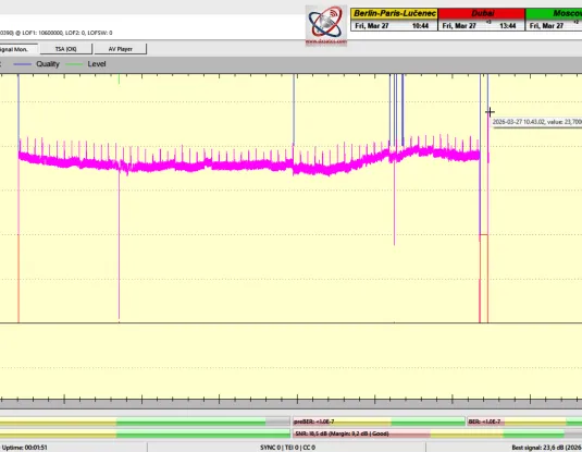 DE>Dies stellt die erste experimentelle Signalüberwachungsleistung über ein kontinuierliches Zeitintervall von t = 72 Stunden dar, während dessen der Dienstanbieter die Parameter SR und FEC auf der Übertragungsseite geändert hat. In diesem Zeitraum erreichte ich die bisher höchste gemessene Qualitätsspitze mit SNR-Werten zwischen 22 dB und 23,7 dB (26.–27. März 2026), nach einem Lock-Ausfall von der Dauer weniger Sekunden, der auftrat, nachdem der Anbieter am 27. März 2026 eine Online-Anpassung der FEC- und SR-Parameter vorgenommen hatte. ( 15 154 - 3/4 > 16 512 - 5/6 )