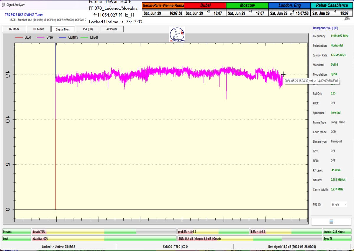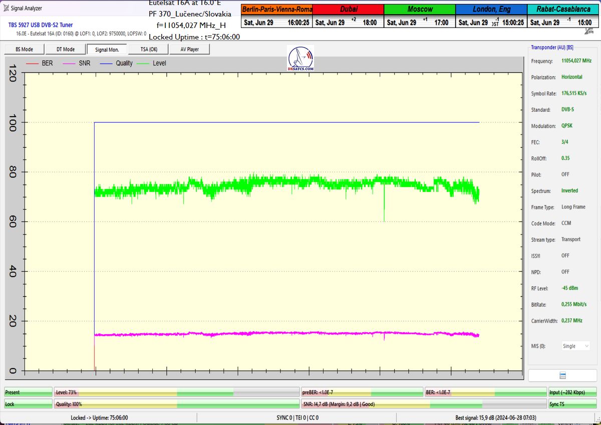 ►Klasifikácia dosiahnutých výsledkov na f=11 054,170 MHz: Dokazovanie v jednotke monitoringu t=75 hodín týmto nespochybniteľne verifikuje stabilitu príjmu na 100% pre rádio prenos s SR=176 ksym/s,čo je v priamom vzťahu so stabilne vysokou intenzitou výkonu okolo EIRP=49 dBW v stredoeurópskej zóne príjmu z vyžarovacieho diagramu EUROPE A na výstupe zo symetrického reflektora s D=370 cm s typickou výškou rezervy v kvalite príjmu okolo 9-10+ dB počas dňa.