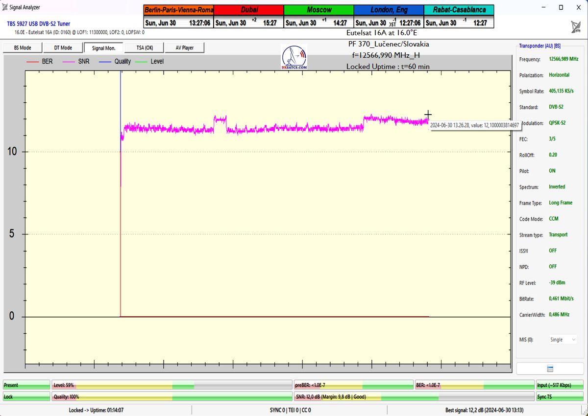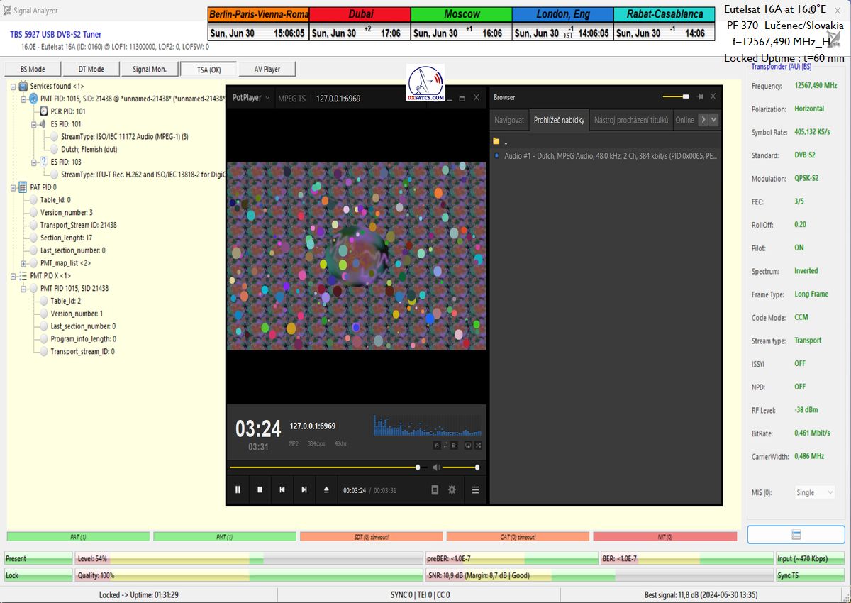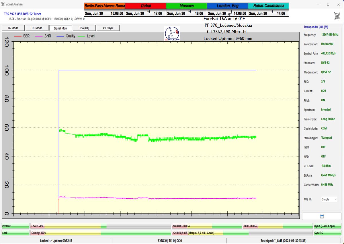 This includes a detailed analysis of today’s examined BNR Nieuwsradio with a symbol rate parameter of SR=176 ksym/s at f=11 054.170 MHz.