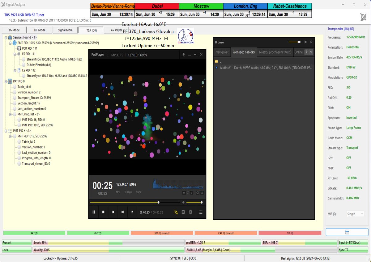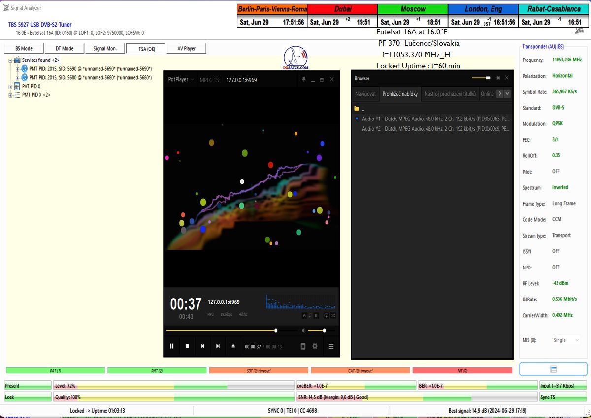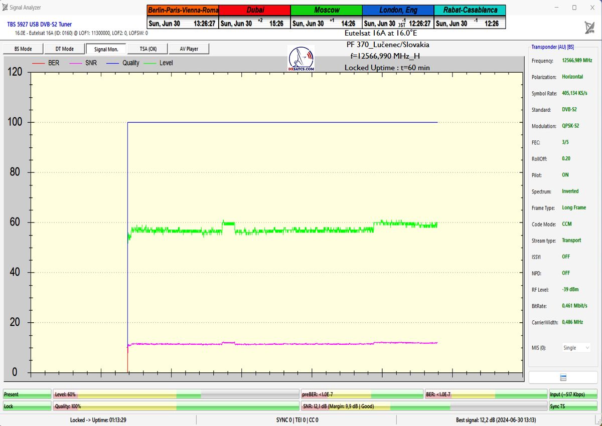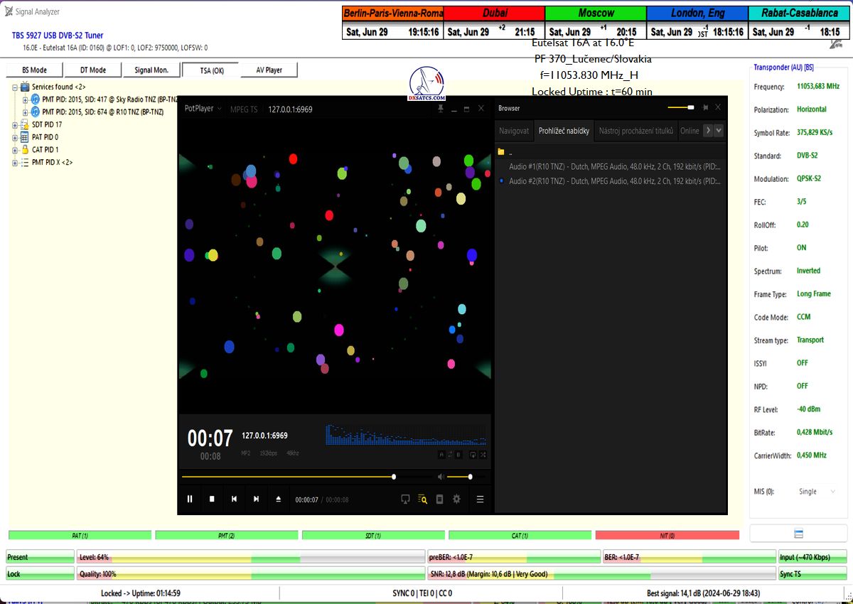 This includes a detailed analysis of today’s examined BNR Nieuwsradio with a symbol rate parameter of SR=176 ksym/s at f=11 054.170 MHz.