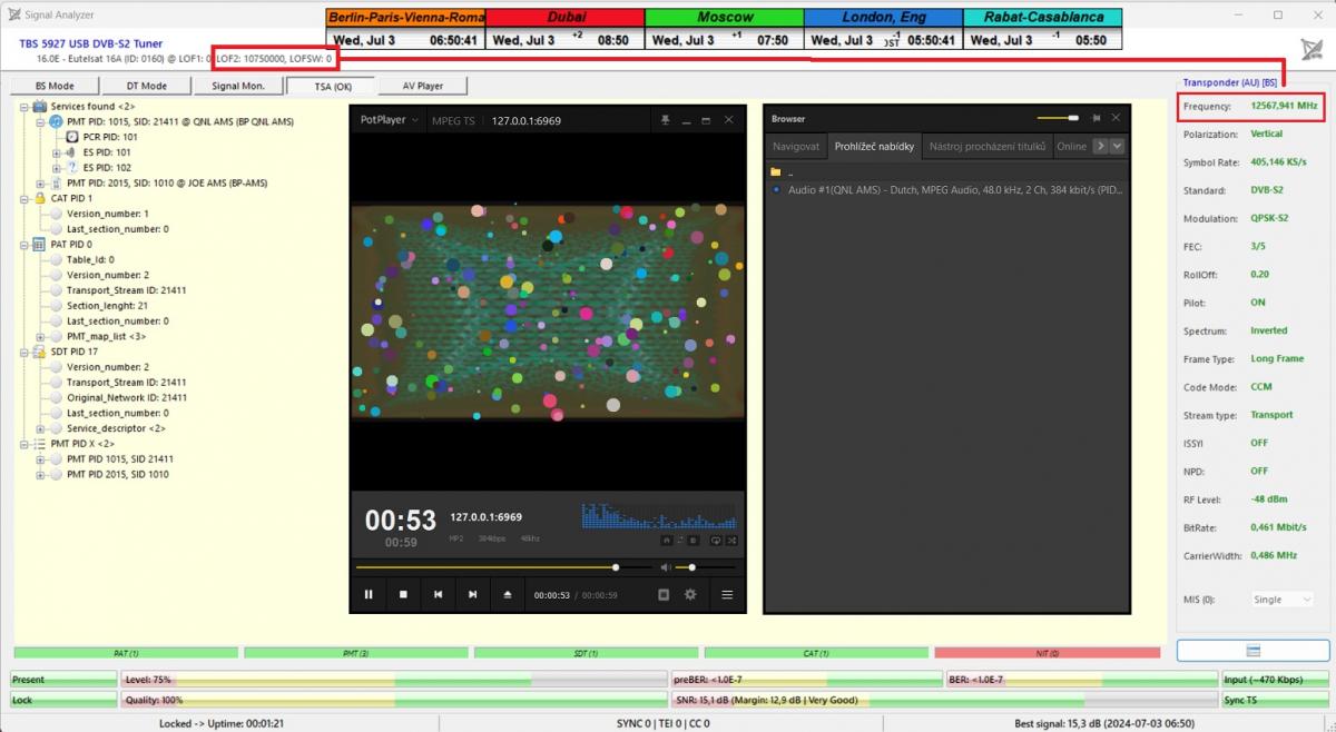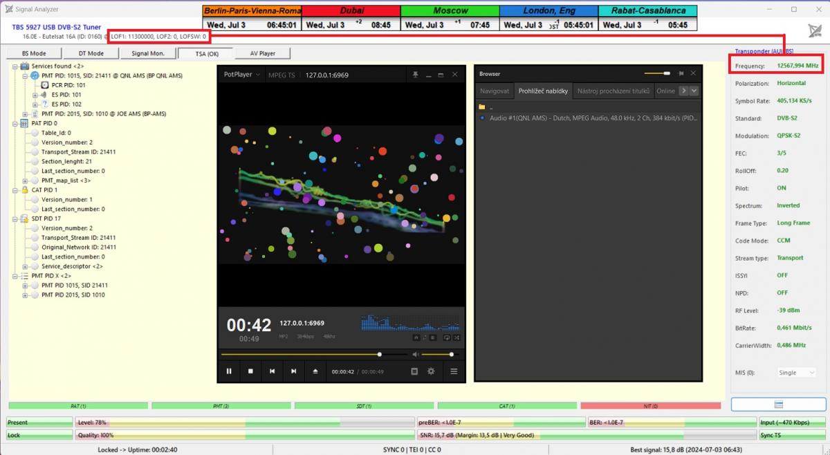 Meine ursprüngliche Aussage vom Anfang des Projekts gilt weiterhin: Die HW/SW-Kombination von TBS 5927 und EBSpro zeigt immer unterstimmte Frequenzenfür das Trägerschloss mit einem Frequenzversatz von typischerweise minus 120 bis 200+ kHz, abhängig von der Auswahl des Oszillators im LNB.
