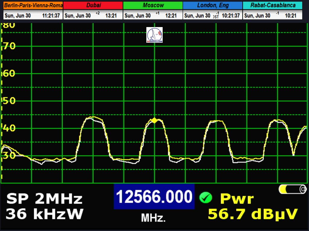 radio carrier Q-Music NL AMS at f=12,567.994 MHz through LOF2 and 12,567.941 MHz through LOF1, resulting in an offset of exactly 53 kHz between