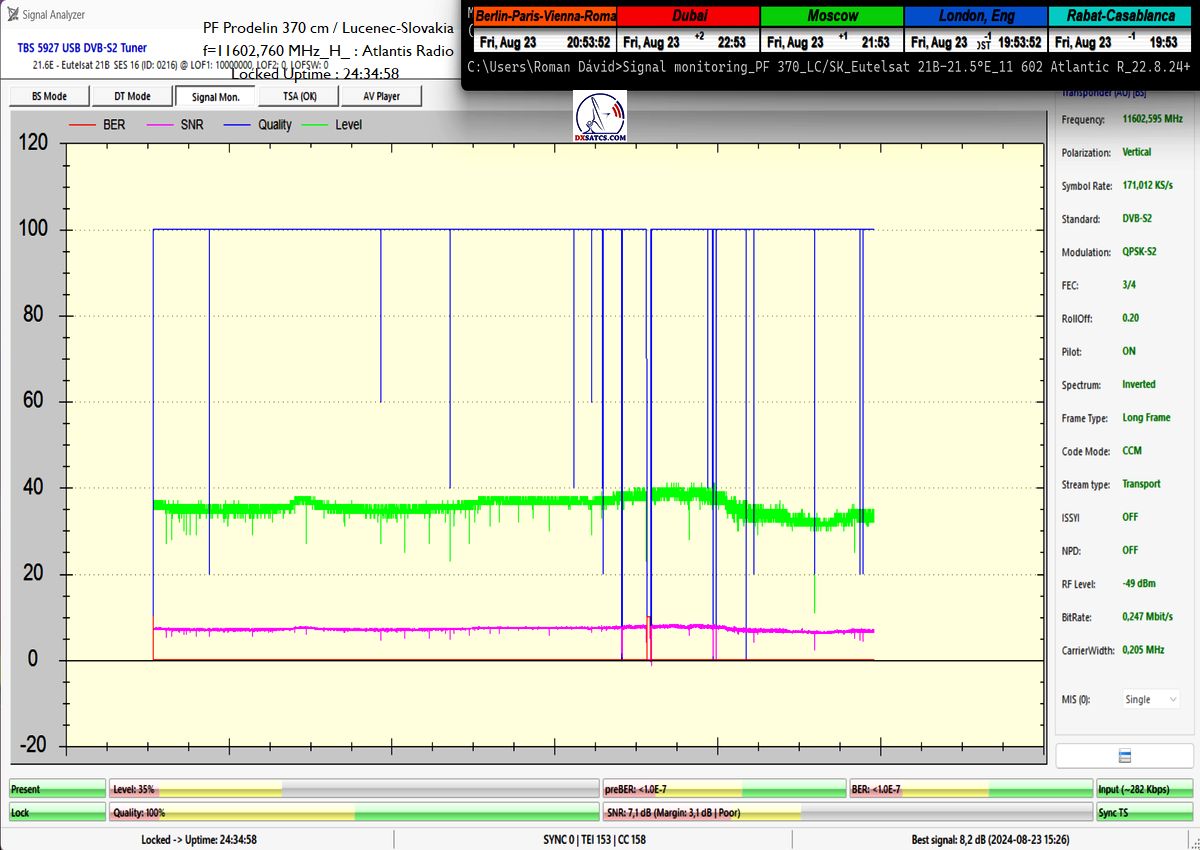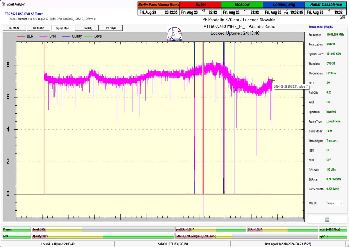 ►Classification of the achieved results: Despite the fact that the peak quality achieved with the applied oscillator LOF1=10.00 GHz exceeded the peak quality of LOF2=9.750 GHz by 0.7-0.8 dB, or 7.4 dB with LOF2 < 8.1 dB-8.2 dB with LOF1, I did not achieve 100% reception stability with either oscillator, and during the 24-hour period, there were typically 8-10 dropouts in the continuity of the Lock, which I can quantify as a degraded reception stability of 99.05% with LOF1 and 99.87% with LOF2. With LOF1, I recorded a total of 4 dropouts lasting around 40 seconds each and one long dropout lasting 780 seconds, amounting to 820 seconds in total, due to the fact that the restoration of the Lock after its loss or dropout is not instantaneous and typically takes around 5 seconds at the given SR=171 ksym/s. Paradoxically, I achieved higher reception stability with LOF2=9.75 GHz than with LOF1, despite the overall higher SNR peak quality by approximately 0.7-0.8 dB with LOF1=10.00 GHz. You may ask how a dropout in the continuity of the Lock is visualized on the signal monitoring graph? The answer: When the blue quality curve (which drops to 0%) and the red BER error rate curve merge on the X-axis, an immediate dropout in the continuity of the Lock occurs, meaning the radio stream data flow freezes. Temporary drops in the blue quality curve (Q) in percentages, for example to levels of 40% or 20%, also have an impact on the smoothness of the data/stream flow, but do not cause a dropout in continuity. This is known as the threshold or limit state of reception with minimal signal reserve in the signal chain.