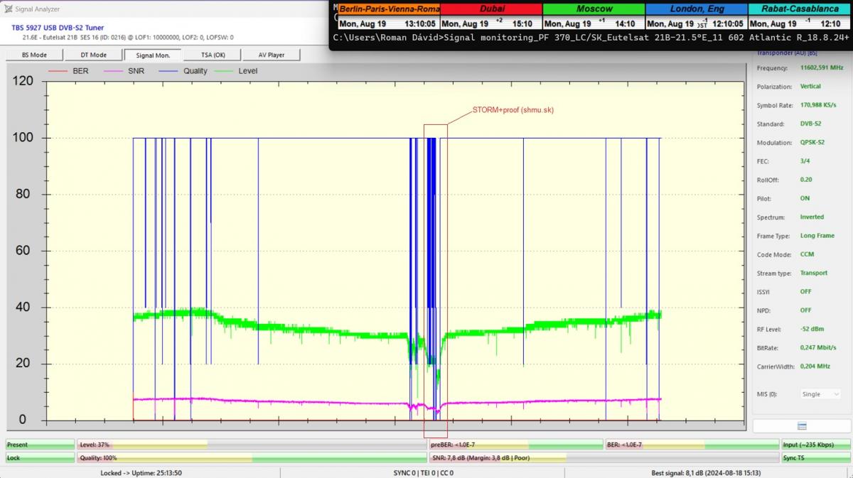 Klasifikácia dosiahnutých výsledkov : aj napriek tomu že dosiahnutá špička kvality pri aplikovanom oscilátor LOF1=10.00 GHz prevyšovala špičku kvality s LOF2=9.750 GHz o 0,7-0,8 dB alebo 7,4 dB s LOF2 < 8,1 dB-8,2 dB s LOF1, ani na jednom z nich som nedosiahol stabilitu príjmu na 100% a počas 24 hodín dochádzalo,typicky 8-10x k výpadkom v spojitosti priebehu Locku,čo môžem percentuálne kvantifikovať ako degradovanú stabilitu príjmu na 99,05% s LOF1 a 99,87 % s LOF2 keď som s LOF1 celkovo 4x zaznamenal výpadky v trvaní okolo 40 sekúnd a jeden dlhý výpadok v trvaní 780 sekúnd,čo je v súčte až 820 sekúnd z dôvodu že obnova Locku po jeho strate,alebo výpadku nie je okamžitá a trvá typicky až okolo 5 sekúnd pri danej hodnote SR=171 ksym/s. Pradoxne som dokázateľne dosiahol vyššiu stabilitu príjmu s LOF2=9.75 GHz ako s LOF1 aj napriek celkovo vyššej špičke kvality SNR o približne +0,7-0,8 dB s LOF1=10.00 GHz. Pýtate sa ako sa v grafe signálneho monitoringu vuzualizuje výpadok v kontinuite priebehu Locku ?