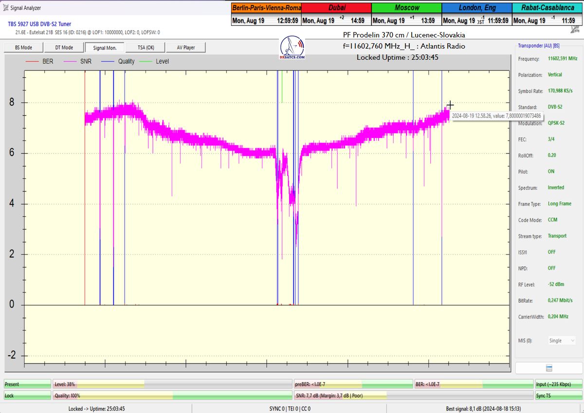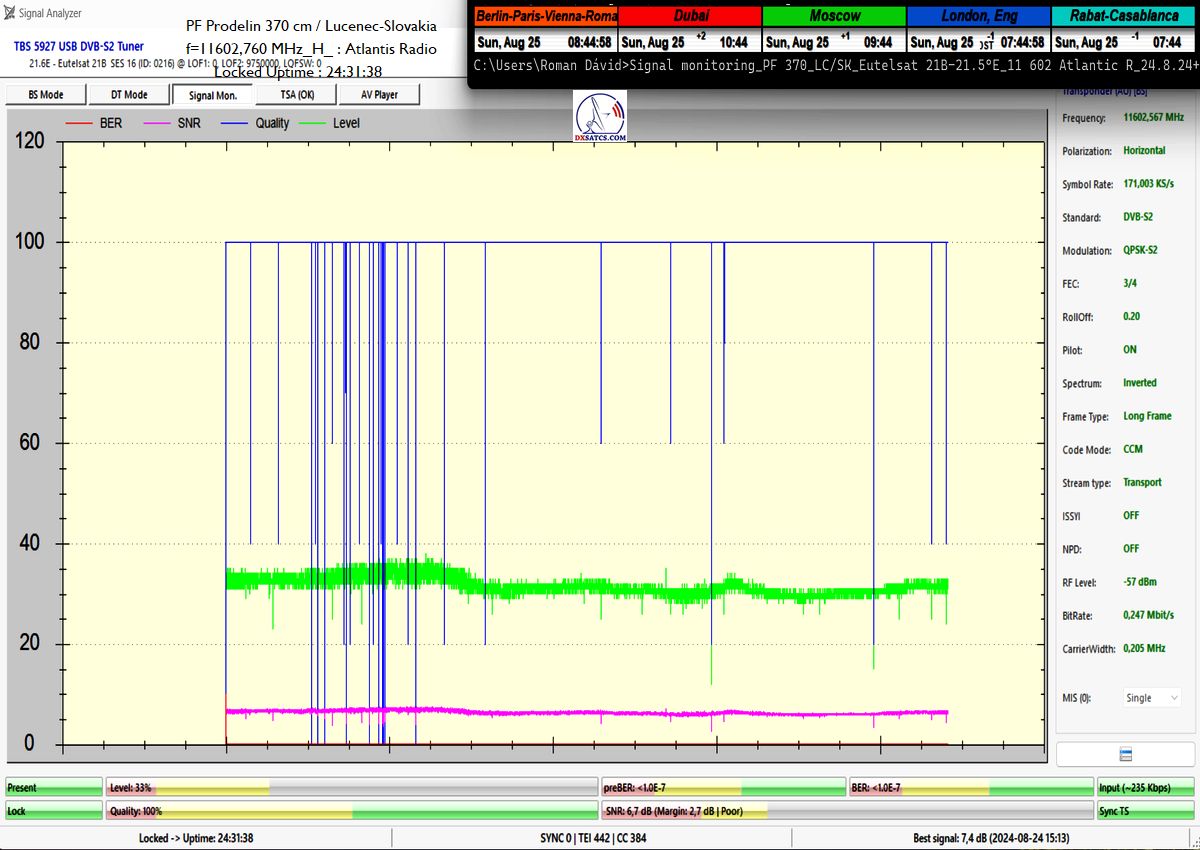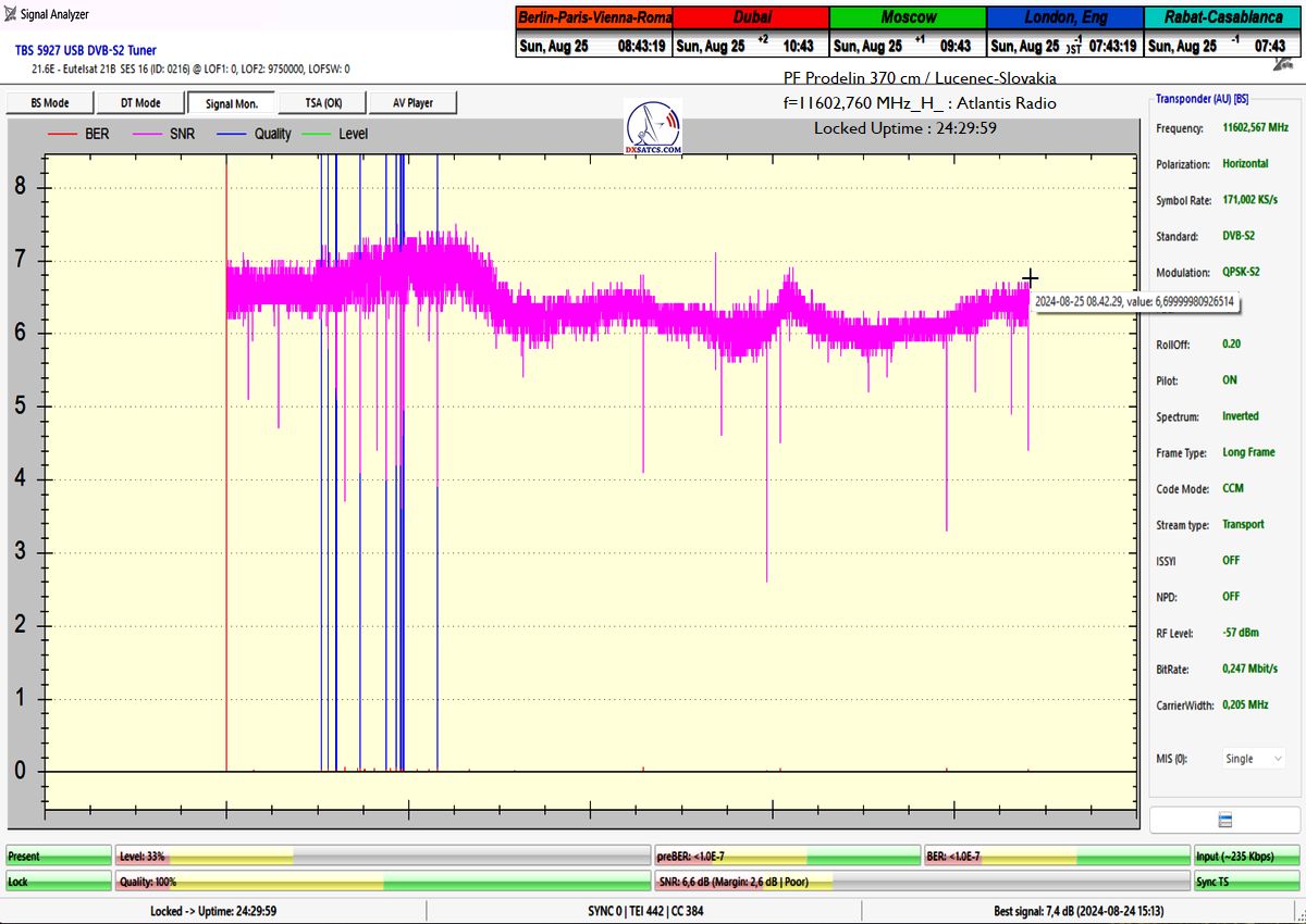 ►Klassifizierung der erzielten Ergebnisse: Trotz der Tatsache, dass die erreichte Spitzenqualität mit dem angewendeten Oszillator LOF1=10,00 GHz die Spitzenqualität von LOF2=9,750 GHz um 0,7-0,8 dB oder 7,4 dB mit LOF2 < 8,1 dB-8,2 dB mit LOF1 übertraf, erreichte ich bei keinem der Oszillatoren eine Empfangsstabilität von 100%, und im Verlauf von 24 Stunden kam es typischerweise 8-10 Mal zu Ausfällen in der Kontinuität des Locks, was ich als eine degradierte Empfangsstabilität von 99,05% mit LOF1 und 99,87% mit LOF2 quantifizieren kann. Mit LOF1 habe ich insgesamt 4 Ausfälle mit einer Dauer von etwa 40 Sekunden und einen langen Ausfall mit einer Dauer von 780 Sekunden aufgezeichnet, was insgesamt 820 Sekunden ergibt, da die Wiederherstellung des Locks nach seinem Verlust oder Ausfall nicht sofort erfolgt und typischerweise etwa 5 Sekunden bei der gegebenen SR=171 ksym/s dauert. Paradoxerweise habe ich eine höhere Empfangsstabilität mit LOF2=9,75 GHz als mit LOF1 erreicht, obwohl die insgesamt höhere Spitzenqualität des SNR mit LOF1=10,00 GHz um etwa 0,7-0,8 dB höher war. Sie fragen sich vielleicht, wie sich ein Ausfall in der Kontinuität des Locks im Signalüberwachungsdiagramm visualisiert? Die Antwort: Wenn die blaue Qualitätskurve (die auf 0% fällt) und die rote BER-Fehlerrate-Kurve auf der X-Achse zusammenfallen, kommt es zu einem sofortigen Ausfall in der Kontinuität des Locks, anders gesagt, der Datenstrom des Radiostreams friert ein. Vorübergehende Einbrüche der blauen Qualitätskurve (Q) in Prozent, zum Beispiel auf 40% oder 20%, haben ebenfalls einen Einfluss auf die Fließfähigkeit des Datenstroms/Streams, führen jedoch nicht zu einem Ausfall der Kontinuität. Dies wird als Schwellen- oder Grenzzustand des Empfangs bei minimaler Signalreserve in der Signalkette bezeichnet.