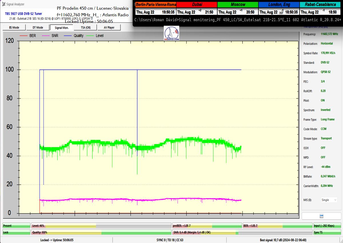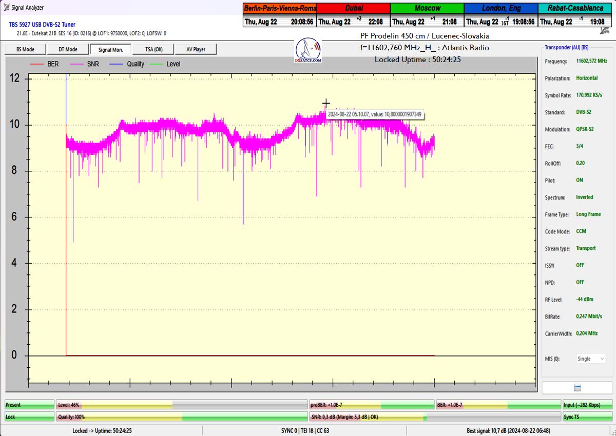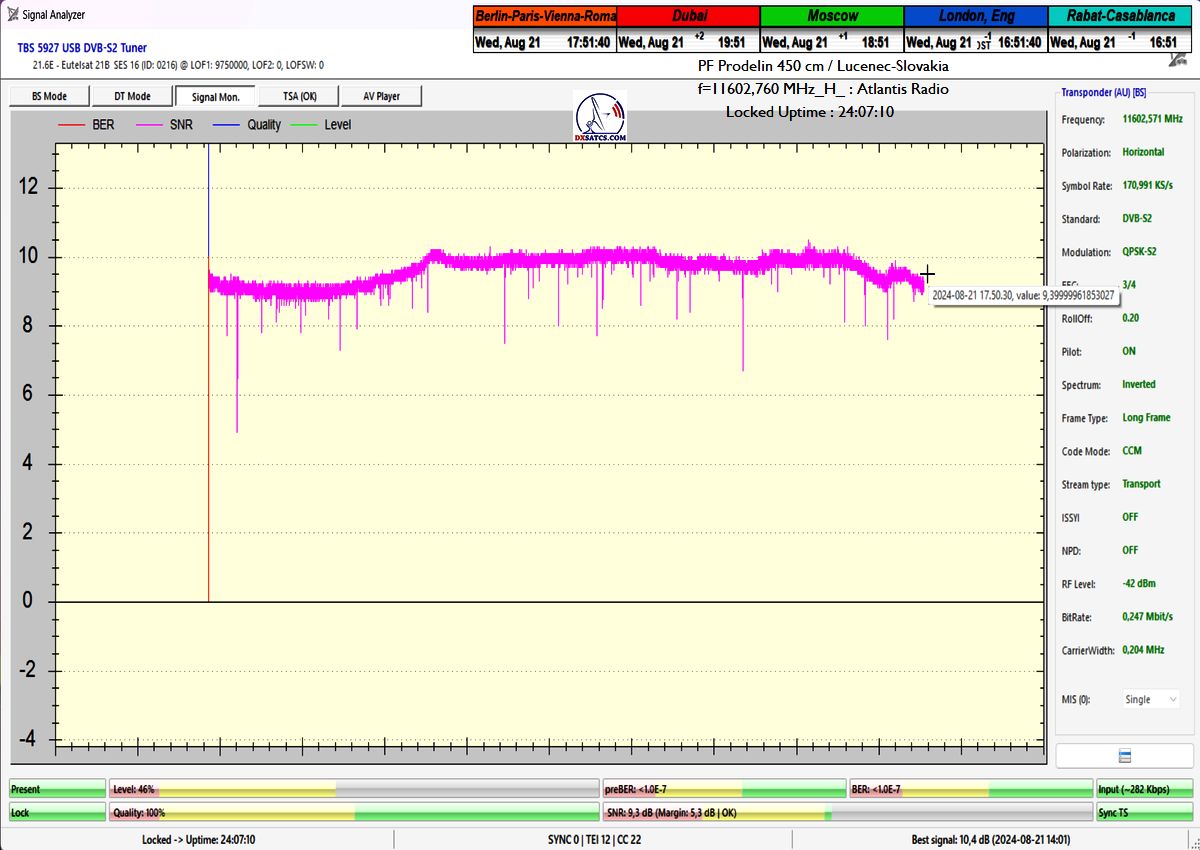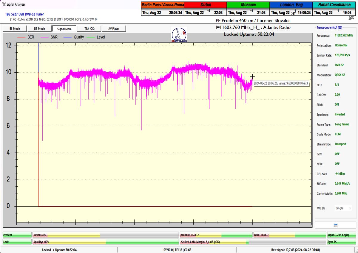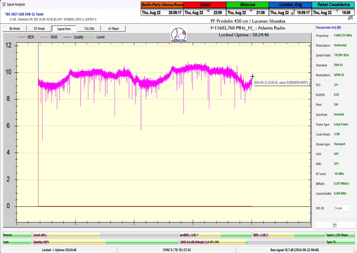 ►Eng_Classification of achieved results at f=11 602,760 MHz: PF 450 cm_The visualized form of proof, based on continuous signal monitoring over a time period of t=50+24 hours, unequivocally confirms that I have achieved a stable reception in practice at 100% without a single dropout in connection with the Lock process, with a peak SNR quality of 10.8 dB under ideal weather conditions. The typical signal margin during the day consistently oscillated in a peak range from 5 to 6.8 dB.