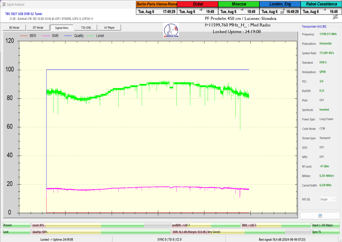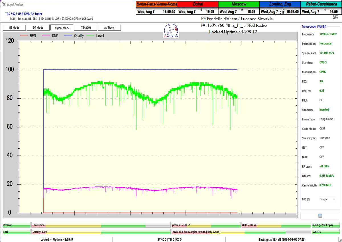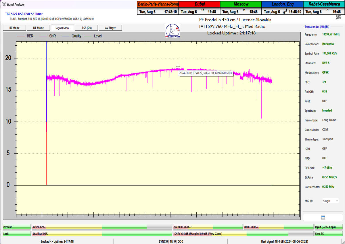 ►Eng_Classification of achieved results at f=11 599,760 MHz: Signal monitoring over a unit length of t=72 hours irrefutably proves that I have achieved 100% reception stability in practice, without a single interruption in Lock continuity throughout the entire monitoring period. The daily peak quality oscillated around an SNR of 18.4 dB, which provides an immediate quality margin of nearly 13 dB with, of course, a zero level of Viterbi Precorrection <1.0E-7. Occasional drops in instantaneous quality never exceeded an SNR of 9.7 dB.