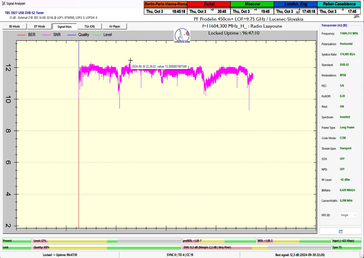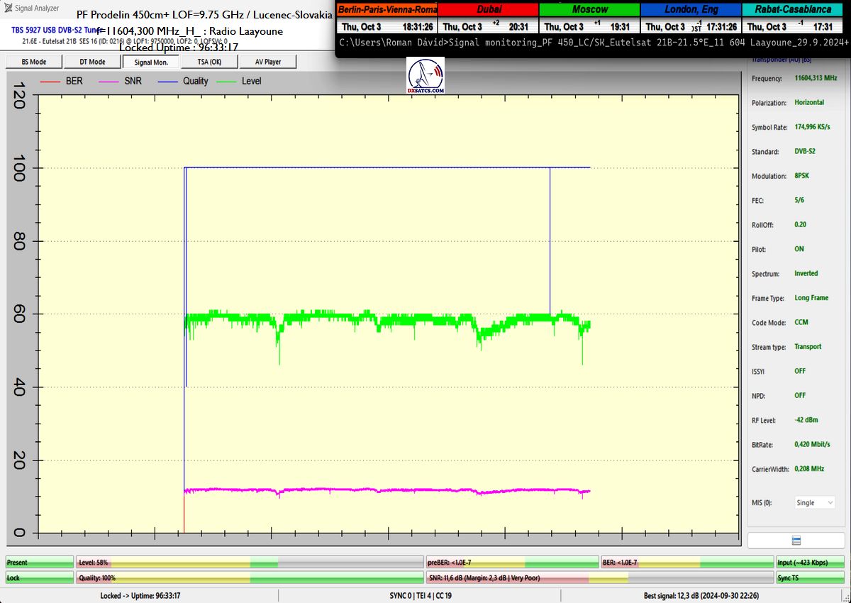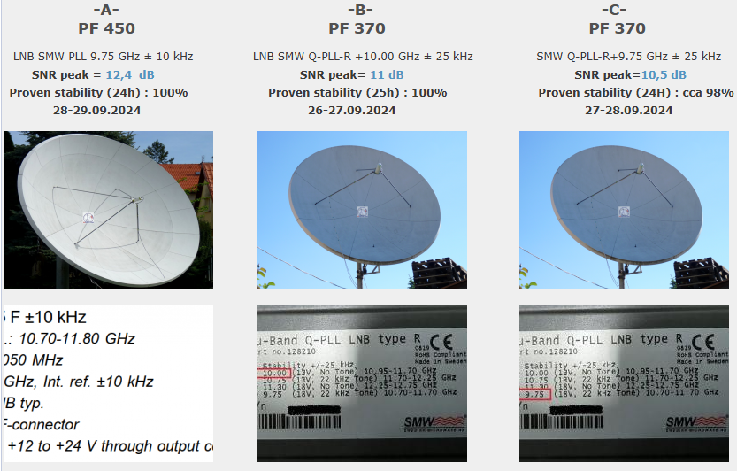 Klasifikácia dosiahnutých výsledkov na f=11 604,300 MHz: PF 450 cm_ V dostatočne dlhej jednotke jedného kontinuálneho monitoringu t=96 hodín som dokázateľne dosiahol stabilný príjem na 100% bez jediného výpadku v spojitosti priebehu funkcie pri minimálnom odstupe C/N=9,4 dB a špičke kvality SNR=12,3 dB a to všetko pri nevyhnutnej nutnosti aplikácie Technologického vynálezu "Synchrónne nanokorekcie" od autora Romana Dávida do systému,ktorá pozostávala z prípravy a  vytvorenia Signálneho modelu a jeho následnej presnej replikácie do parametrov anténneho systému Prodelin 450 cm.Ako to následne dokážem presná replikácia vytvoreného signálneho modelu do anténneho systému generuje okamžitý rast signálnej kvality v tomto prípade od 0,5 do 0,7 dB/SNR,a posilňuje tým odolnosť signálneho reťazca pred výpadkom v kontinuite Locku nosnej s relatívne nízkou veľkosťou signálnej rezervy od 2 do 3 dB.Celkovú stabilitu na 100% som dosiahol aj napriek výrazne zhoršeným poveternostným podmienkam od 2 do 3.10.2024_pozri dáta z shmu.sk