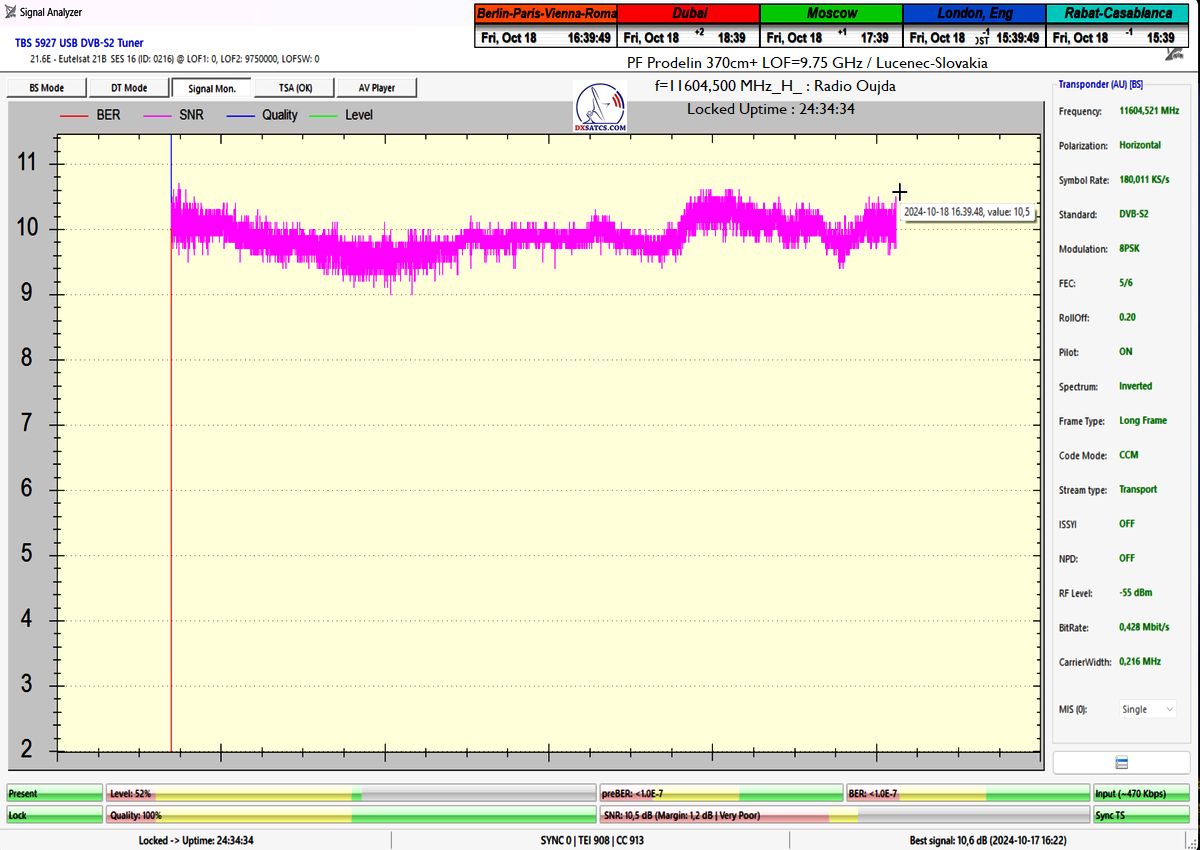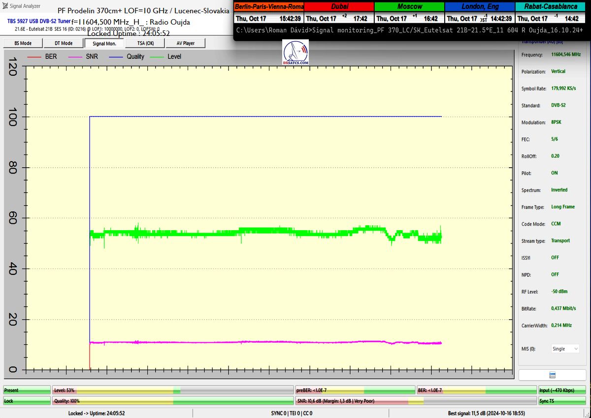 EN:This is the very first course of proof over a minimal unit of t=24 hours with LOF=10 GHz at the output of PF 370 cm, where I achieved an exemplary performance without even a single drop in the blue quality curve (Q) from the level Q=100%, with a minimal C/N margin of 9.4 dB for carrier lock with the applied parameter SR=180 ksym/s. The signal margin throughout the day oscillated in a typical range from 0.5 to 2.0+ dB, which is why I classify this proof as non-replicable over a longer monitoring unit, for example, t=48-72 hours, and under slightly worsened weather conditions. With a probability bordering on certainty, I would not achieve this exemplary result again at the output of PF 370 cm during a monitoring unit of t=48-72 hours, because the signal margin would subsequently oscillate and reach the noise threshold at a minimal C/N margin of 9.4 dB for carrier lock. In short, an objective result requires a longer time period for the monitoring unit and slightly worse weather conditions, not the almost ideal ones that occurred exceptionally during this monitoring in the city of Lučenec.