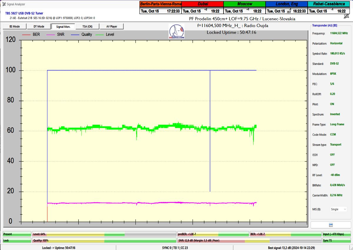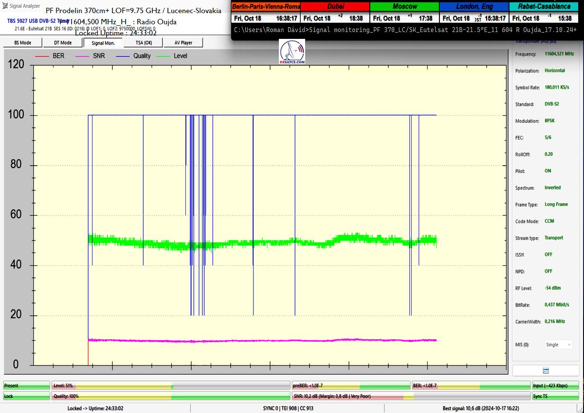 SK: EUT 21B_11 604,500 MHz-Radio Oujda : Dokázaná kontinuita funkcie locku,alebo stabilita príjmu na 100% na výstupe z PF 450+370 cm na každom z troch oscilátorov v celkovej kvantite dokazovania t=144 hodín,pre rádio nosnú s aplikovanou hodnotou Symbolovej rýchlosti SR=180 ksym/s a so špičkou kvality SNR=13,7 dB