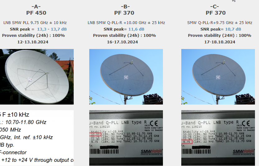 ►SK_Klasifikácia dosiahnutých výsledkov na f=11 604,500 MHz: PF 450 cm_Aj napriek výskytu dažďových prehánok v dvoch z celkovo troch dní,počas ktorých dňa 15.10.2024 o 6:07 ráno došlo k jedinému poklesu kvality Q na úroveň okolo šumového prahu Q=20%,som dokázateľne dosiahol stabilitu príjmu na 100% bez jediného výpadku v kontinuite priebehu Locku v dostatočnej jednotke monitoringu t=72 hodín.Zaznamenal som špičku kvality SNR=13,3 dB a výška signálnej rezervy počas dňa oscilovala v typickom rozsahu 2-3+ dB.Replikácia signálneho modelu do anténneho systému v podobe mojej technológie "Synchrónne nanokorekcie" bola úspešná a jej okamžitý prínos do rastu kvality predstavoval od 0,2 do 0,5+ dB +dôkaz.