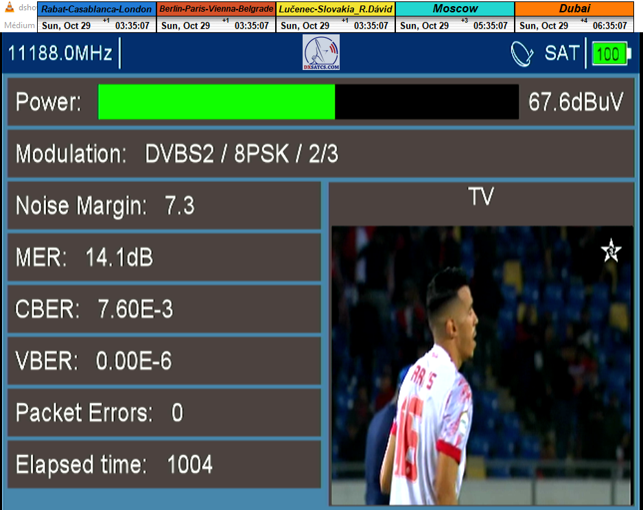 v štandarde DVB-S2/8PSK,dnes dokážem dosiahnutie exemplárneho stavu aj pri vysokom úhrne zrážok na frekvencii marockého provajdera SNRT Arryadia