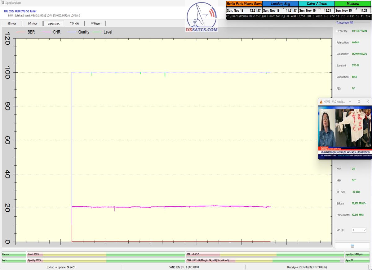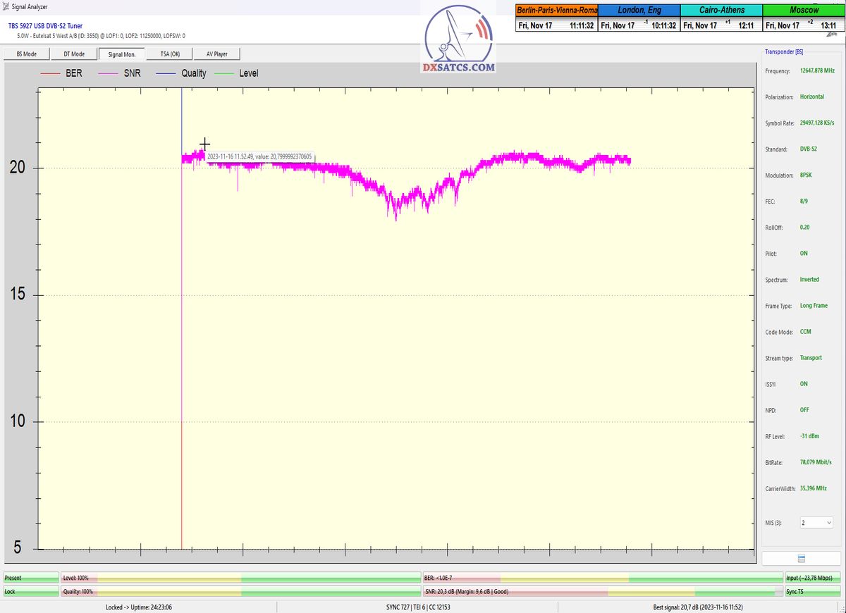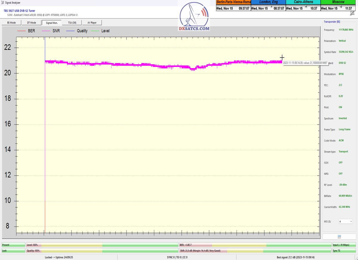Na príklade dokazovania v podobe signálneho monitoringu paketov Rai a Canal+,vysielaných v technologickom štandarde DVB-S2/Multistream z objektu Eutelsat 5 West B na 5,0°W,Vám dnes dokážem že som účinne a hlavne stabilne transformoval relatívne vysokú intenzitu vyžiareného výkonu EIRP na výslednú kvalitu ,ktorú kvantifikujem pomerom signálu k šumu SNR=20>21+ dB-pri aplikovanej konfigurácii modulačných