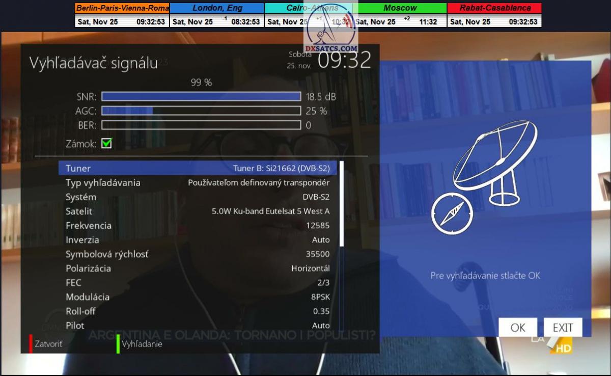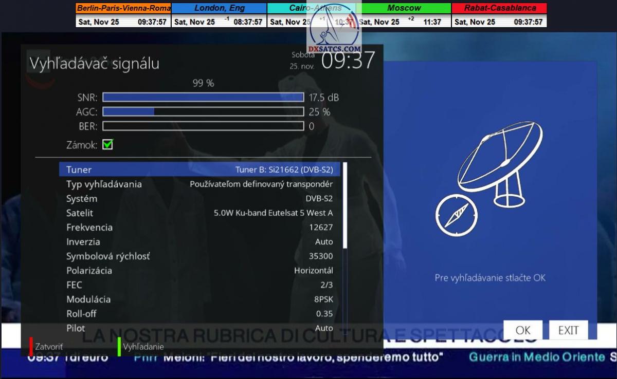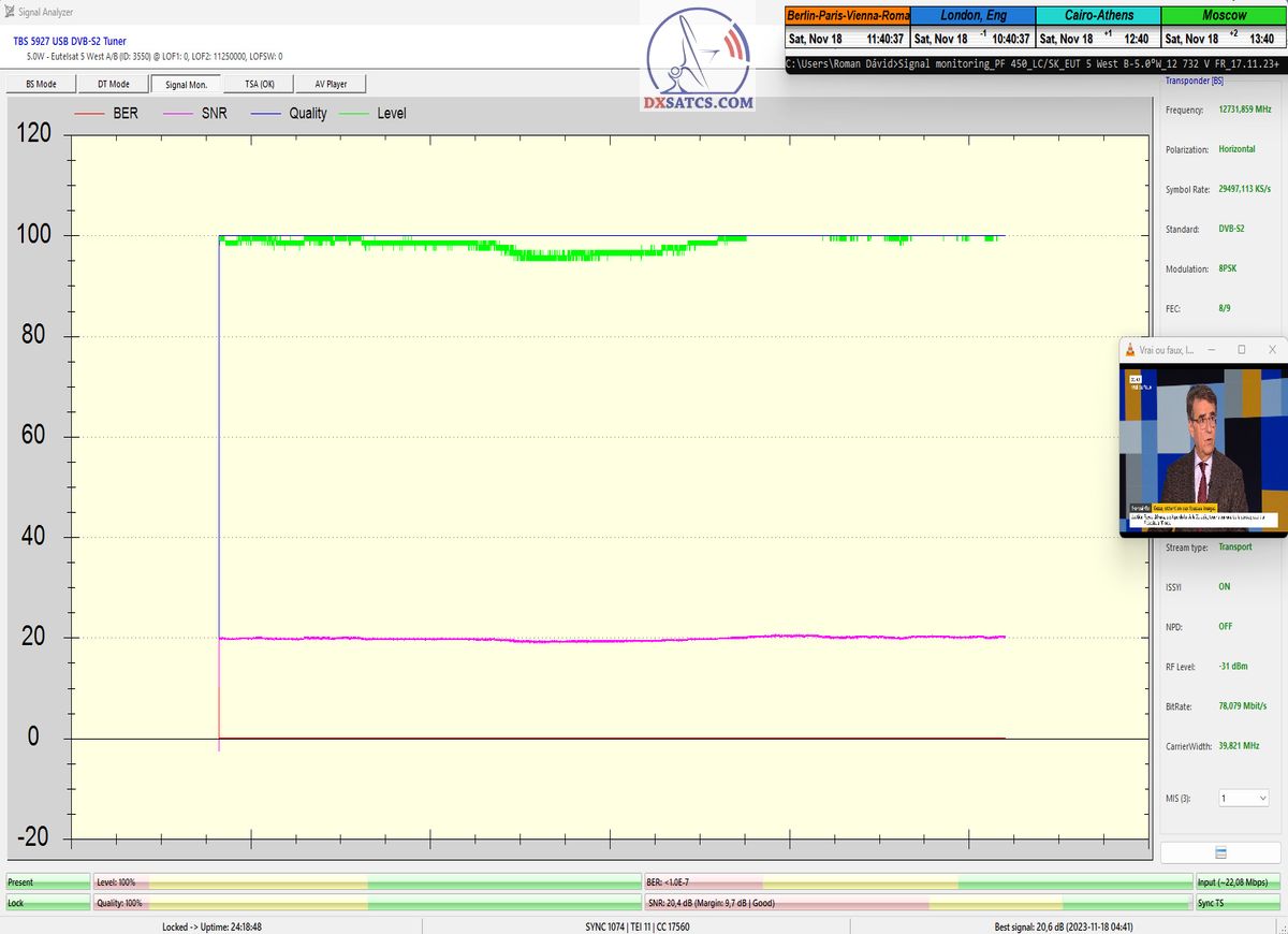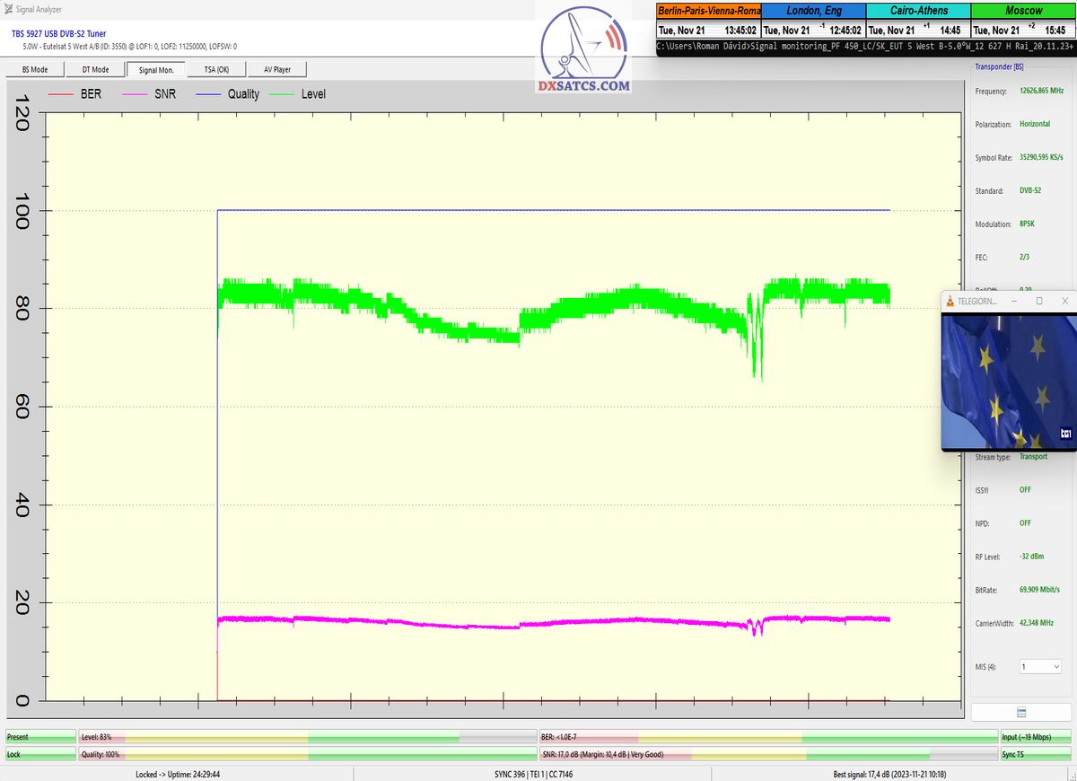 Na príklade dokazovania v podobe signálneho monitoringu paketov Rai a Canal+,vysielaných v technologickom štandarde DVB-S2/Multistream z objektu Eutelsat 5 West B na 5,0°W,Vám dnes dokážem že som účinne a hlavne stabilne transformoval relatívne vysokú intenzitu vyžiareného výkonu EIRP na výslednú kvalitu ,ktorú kvantifikujem pomerom signálu k šumu SNR=20>21+ dB-pri aplikovanej konfigurácii modulačných