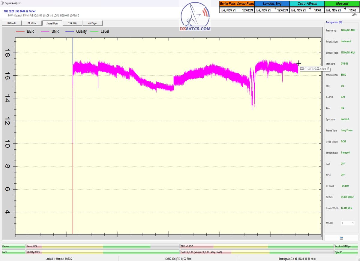 ►►Eutelsat 5 West B at 5.0°W-Transalpine-Multistream : Proving in the monitoring unit t=24 hours