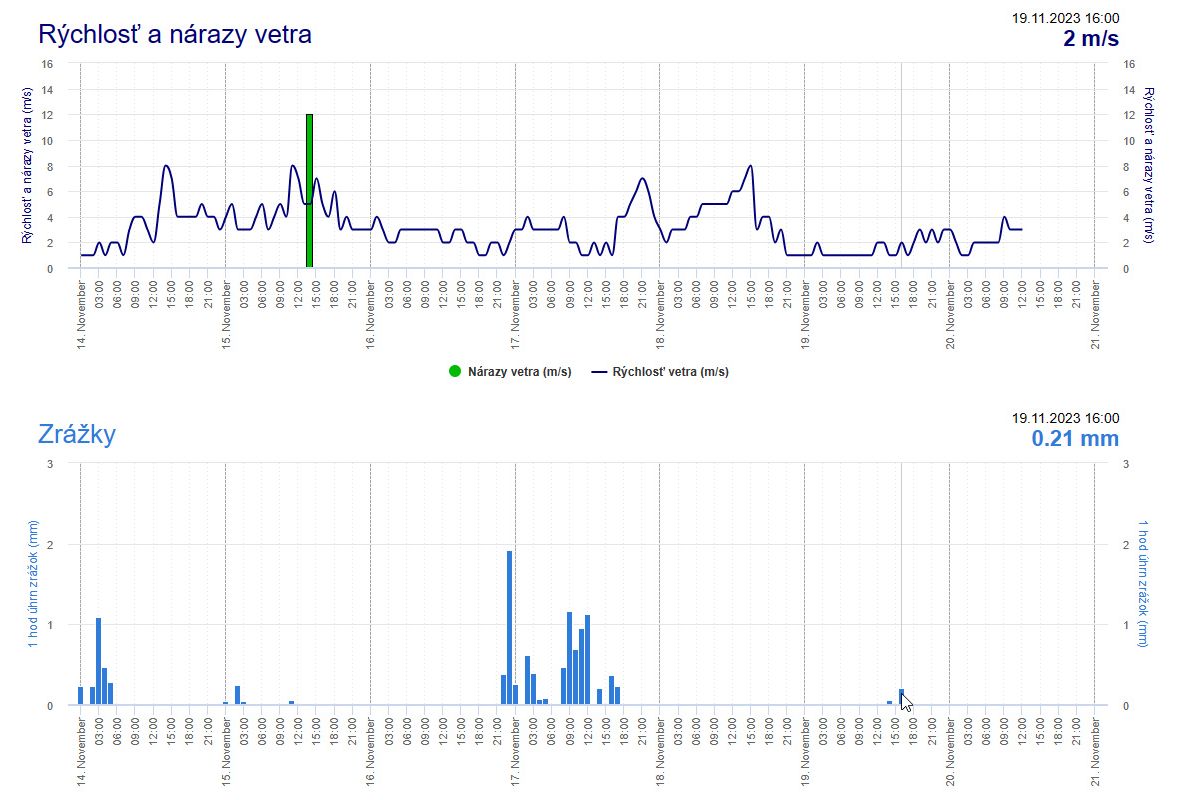 ►Results of wind speed and precipitation measurements for the location of the automatic meteorological station in the village of Boľkovce near Lučenec,spanning from November 13 to November 21, 2023, demonstrate that precisely in five out of the eight monitored intervals, monitoring activity was accompanied by rain showers with varying precipitation amounts. (source : shmu.sk)