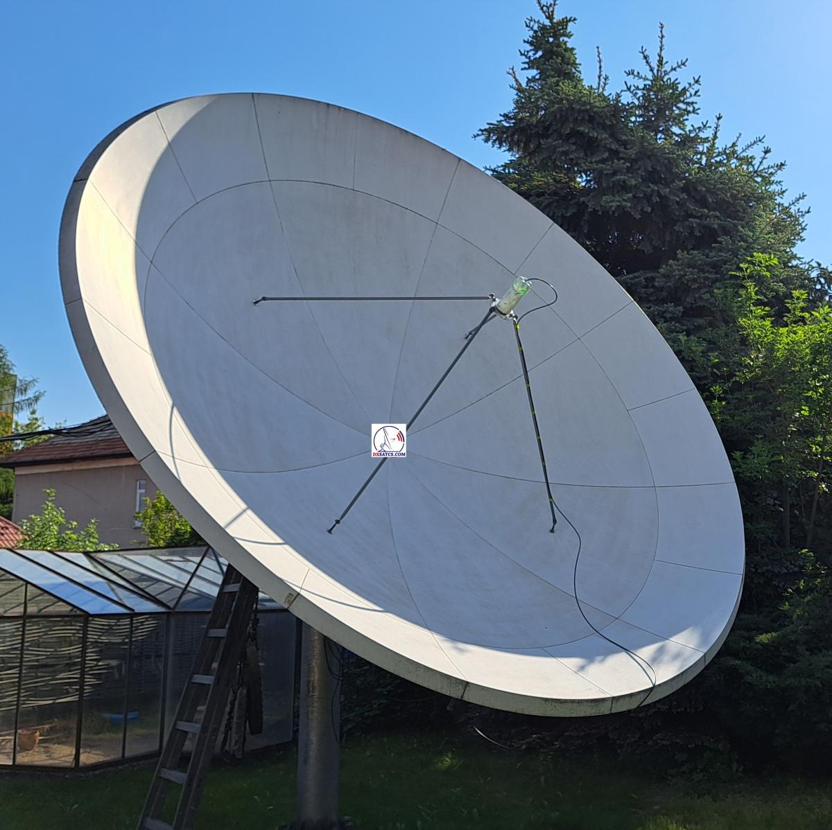 ►Reflector PF Prodelin 450 cm > Primary feed horn positioned in a manual SKEW rotation mechanism > OMT orthomode transducer, model ESA-1212-X/1 >SMW_Q-PLL type R LNB with LOF stability +/- 25 kHz, SMW_Q-PLL type O LNB with LOF stability +/- 10 kHz, and SMW PLL LNB 9.75 GHz with LOF stability +/- 10 kHz +self-made cardboard cover from a non-alcoholic beverage package by the Swiss company SIG-Combibloc, onto which I applied a waterproof, weather-resistant film.