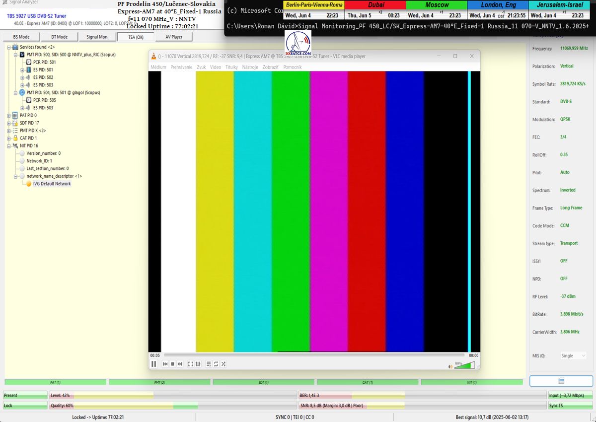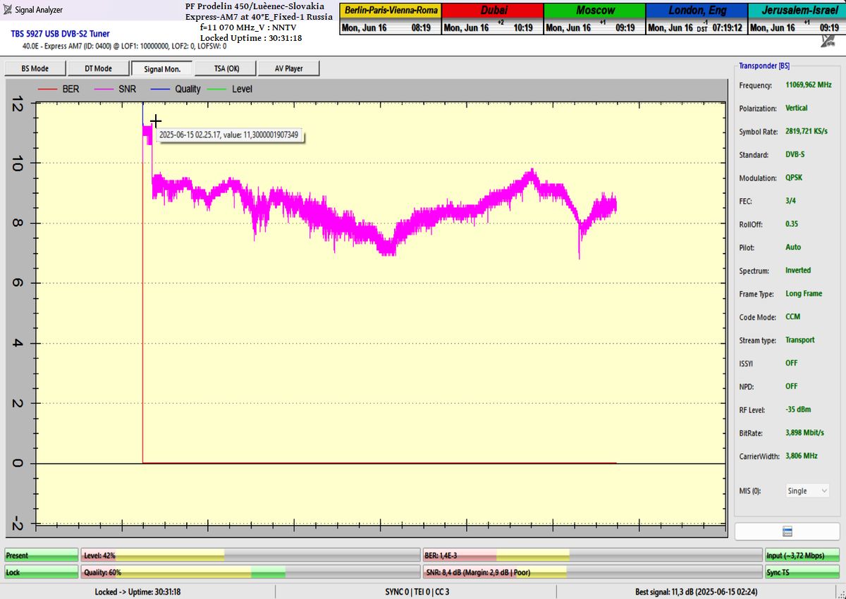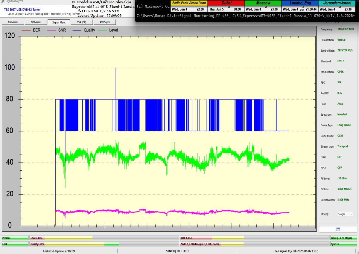SK_Výsledky signálneho monitoringu nespochybnitelne dokazujú že som v jednotke monitoringu t=77 hodín,nosnej frekvencie NNTV na f=11 070 MHz_V, dokázatelne dosiahol stabilný príjem na 100% bez výskytu čo i len jedného výpadku v spojitosti priebehu funkcie Locku alebo pixelácie. Zaznamenal som špičku kvality SNR=10,7 dB a jediný výskyt poklesu modrého priebehu kvality Q na hladinu Q=40% sa odohral presne 1x a to po príchode búrkovej oblačnosti a výskyte dažďových prehánok dňa 1.6.2025 presne o 20:35 SEČ,čo nespochybniteľne dokazujú výsledky meraní úhrnu zrážok zo zdroja shmu.sk.