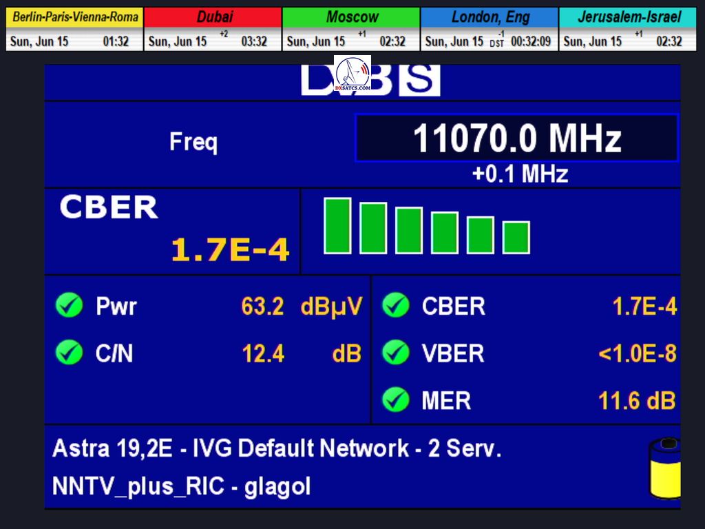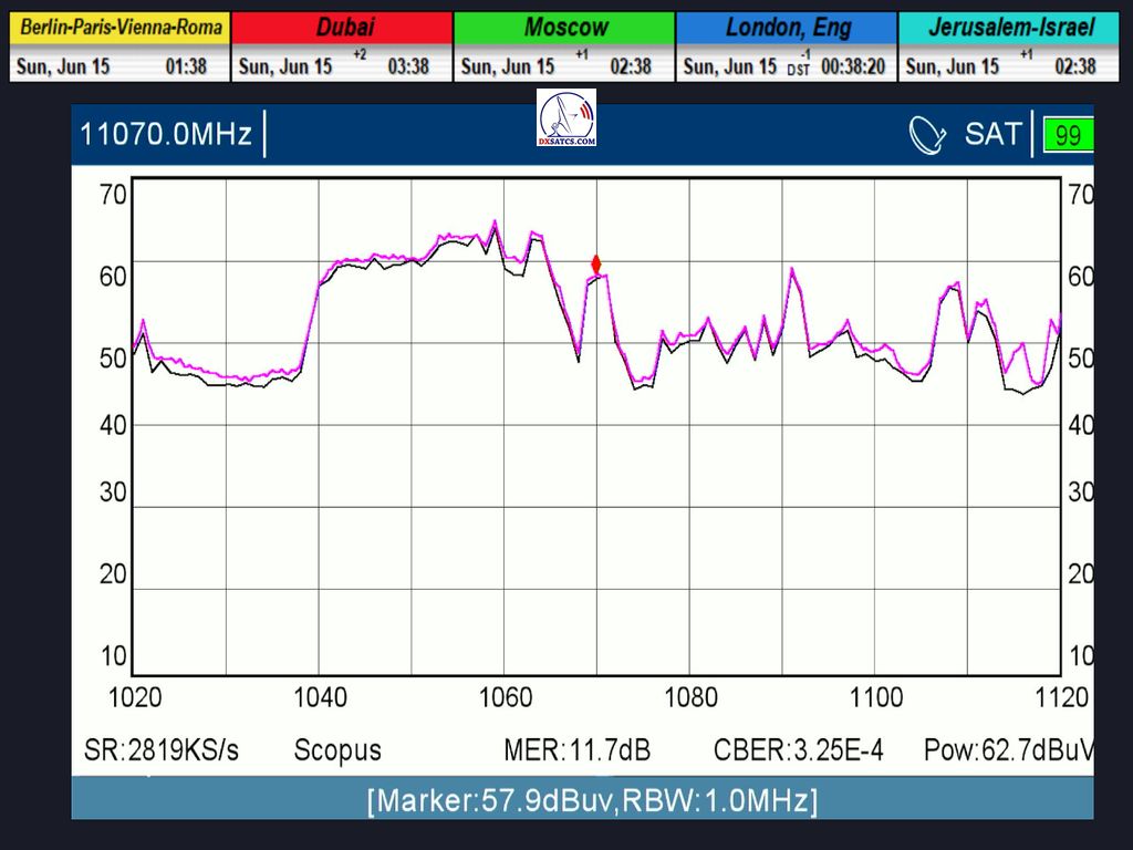 ►Modulácia: QPSK (DVB-S) ►Špička kvality SNR:10,7 dB (celková špička SNR=11,3 dB)