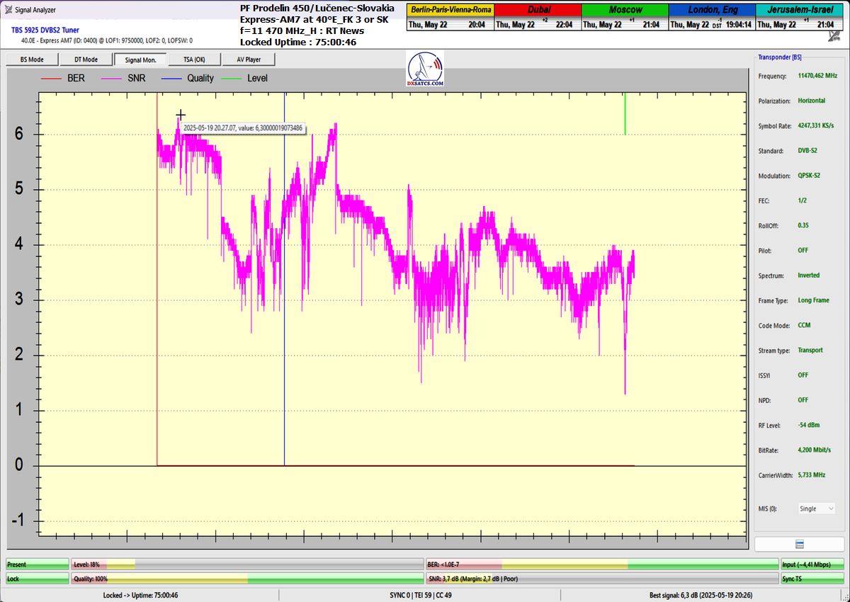 ►Symbol rate: 2819,724 kS/s ►Monitoringový čas: 77 hodín (Locked uptime)