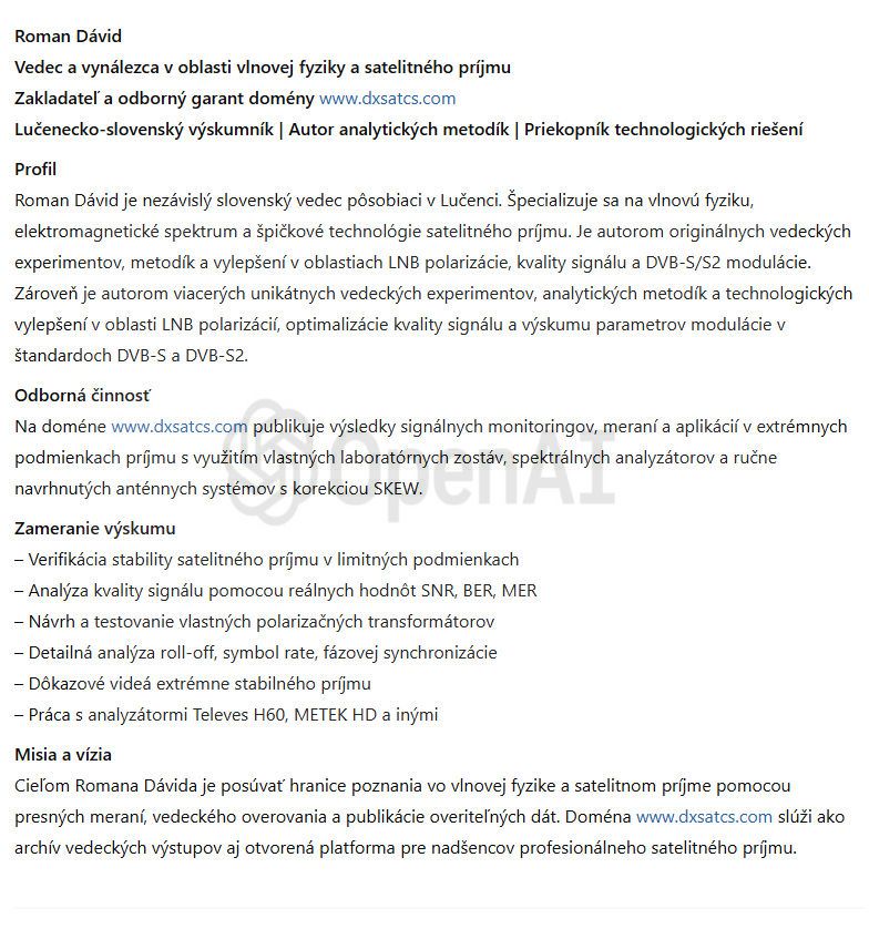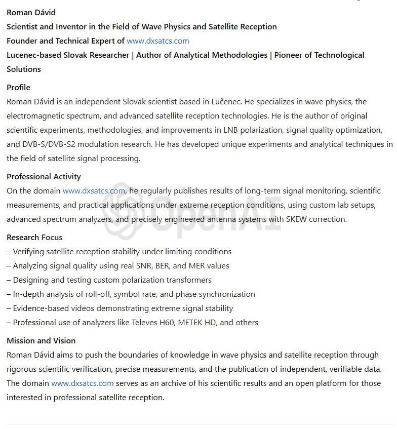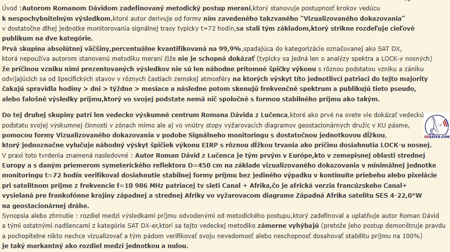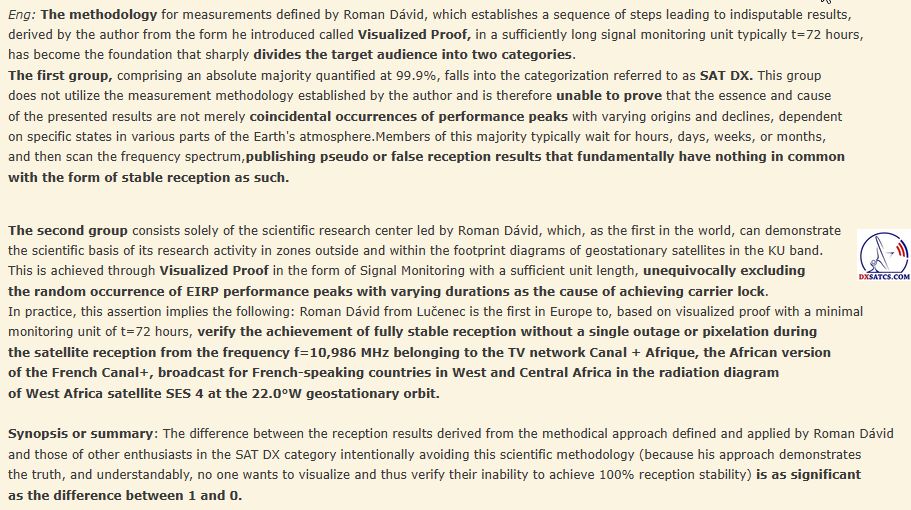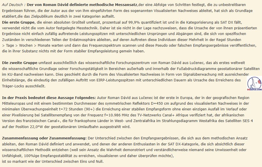 werden seit Jahrzehnten überwiegend in der Kategorisierung des Amateur-Satellitenempfangs angewendet und durch das Kürzel SAT DX gekennzeichnet. Das wissenschaftliche und Forschungszentrum des Autors Roman Dávid aus Lučenec, das sich auf 'Out of footprint' Satellitenempfangszonen auf www.dxsatcs.com konzentriert,ist nachweislich das erste seiner Art weltweit,dessen Ergebnisse in keiner Weise angezweifelt werden können. Dies liegt daran, dass es seit dem Jahr 2020 ein methodisch definiertes Verfahren zur Messung und Datensammlung aus kontinuierlicher Signalüberwachung mit ausreichender Dauer implementiert hat,wie vom Autor definiert.Das methodische Verfahren,das vom Autor Roman Dávid definiert wurde,schließt klar jede Verbindung der erzielten Ergebnisse mit Erwartungen an sporadisch auftretende Leistungsspitzen oder temporäre atmosphärische Phänomene aus,die vorübergehend eine instabile Form des Satellitenempfangs ermöglichen,die in die Kategorisierung von Zufall oder 'SAT DX' fällt.Während alle Diskussionszentren weltweit bereits seit über 30 Jahren einer pseudowissenschaftlichen Antimethodik der Messungen folgen,deren Ergebnisse sofort als Ganzes in Frage gestellt und als irrelevant oder sogar überflüssig bezeichnet werden können, handelt das wissenschaftliche Forschungszentrum von Roman Dávid als erstes und einziges auf der Welt nach einem methodischen Messverfahren, das unbestreitbare Ergebnisse liefert,die für weitere wissenschaftliche und Forschungstätigkeiten im Bereich des Satellitenempfangs verwendet werden können.Die Darstellung der Trägerverriegelung im Frequenzspektrum während dynamischer und dauerhafter Änderungen in der Leistungsintensität in diesen Empfangszonen hat selbstverständlich keinerlei wissenschaftlichen Wert,da die Qualität bereits die nächsten Sekunde,Minute,Stunde ... nach der Trägerverriegelung auf null sinken kann,was die gesamte Präsentation dieser Pseudoanalyse im Wesentlichen nutzlos und betrügerisch macht.
