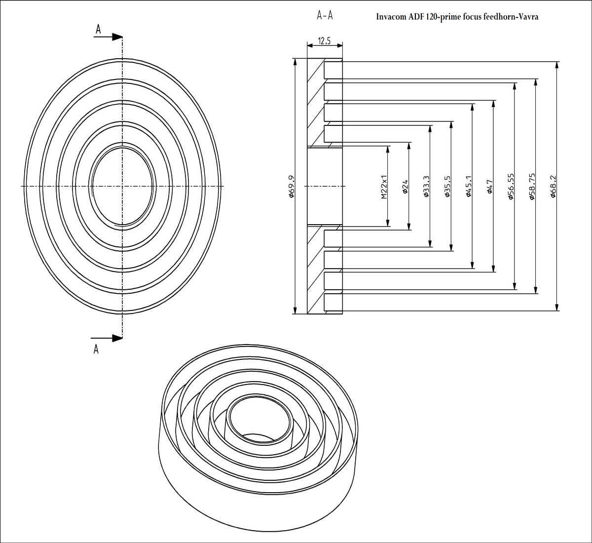 a,Feedhorn Invacom ADF-120_dimensions: Rozmery ožarovača pre stredové antény