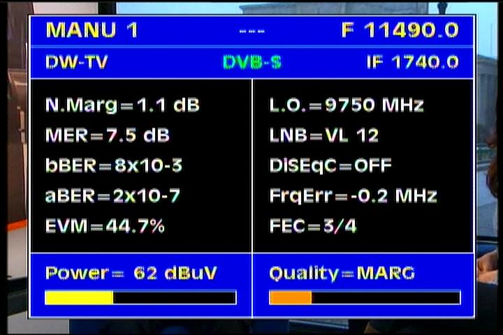 of reception follows.Average reception quality, expressed in the unit MER=9.5-11.5 dB (with occasional peak at MER=15+ dB)