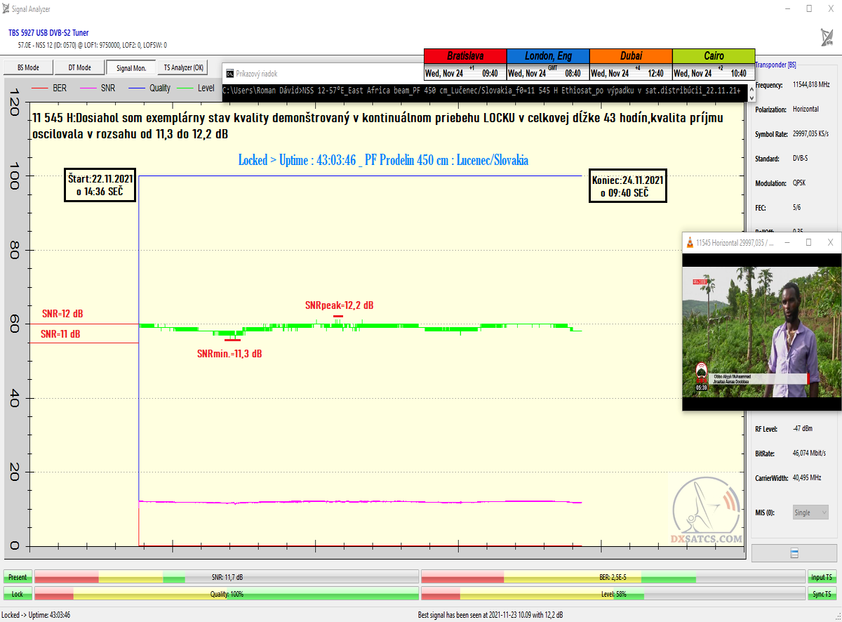 A práve tento typ môjho staronového vlnovodu z roku 2009 s jedným neštandardným/netabuľkovým rozmerom som aplikoval pri nasledujúcom dokazovaní v podobe kontinuálne/neprerušovane vykonávaného signálneho monitoringu na referenčnej frekvencii f0=11 545 H satelitnej siete Ethiosat až do momentu celkového vypnutia jej satelitnej distribúcie dňa 21.11.2021 o 23:21 SEČ. Nasledujúca vizualizácia dosiahnutej kvality na referenčnej frekvencii "f0" v celkovej dĺžke t=30+43 (73) hodín s :