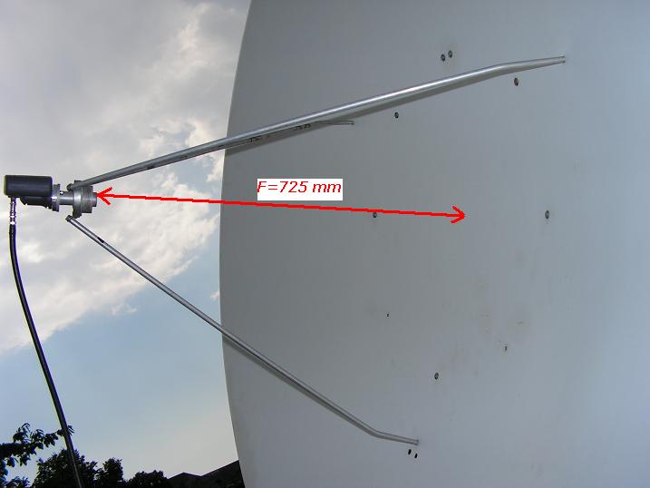 Klasickým výpočtom v ktorom pomer násobku aktívneho priemeru D antény delíme násobok 16 a hĺbky samotnej antény nezaručuje v tomto prípade presné stanovené ohnisko aj keď samotná reflektorová stena vykazuje presný nepoškodený tvar,čiže musel som s meracím prístrojom hľadať maximálnu koncentráciu signálnej energie - ohniska.Z predchádzajúcich meraní s anténou Kovosat 140 cm som vedel akej signálnej kvality som dosiahol na V transpondéroch družice Astra 2D a aby samotná inštalácia väčšieho priemeru mala zmysel musel som dosiahnúť aj nárast kvality príjmaného vysielania ITV a BBC Anglicko,kedže jednokusová nepoškodená reflektorová stena antény MABO 180 cm dávala predpoklad želaného nárastu kvality príjmaného signálu za predpokladu presnej definície ohniska čo sa aj nakoniec podarilo,ale ani samotný výrobca zrejme nepredpokladal že ohnisko bude 4 cm presne ako vidno z obrázku F=72,5 cm pod možným úchytom ožarovača,čiže aby som vôbec dosiahol z ožarovačom do ohniskovej vzdialenosti F=72,5 cm bez toho aby som musel skrátiť 3 ks nosných rúrok ,ktoré držia LNB,musel som zaradiť medzikruh medzi ožarovač a úchyt aby som vôbec dosiahol na ohniskovú vzdialenosť !!! V prípade že by som nanovo nezadefinoval ohniskovú vzdialenosť antény MABO 180 cm ,nikdy by som celodennú signálnu rezervu okolo 1 dB MER pri chybovosti v ráde E-02 a E-03 nedosiahol a výsledné kvalitatívne signálne úrovne by dosahovali výsledky s anténou Kovosat 140 cm,kde príjem ASTRY 2D V pol je možný pri správnom návrhu signálneho reťazca len okolo 12 h denne pri vysokej chybovosti v ráde E-02 po celý deň.
