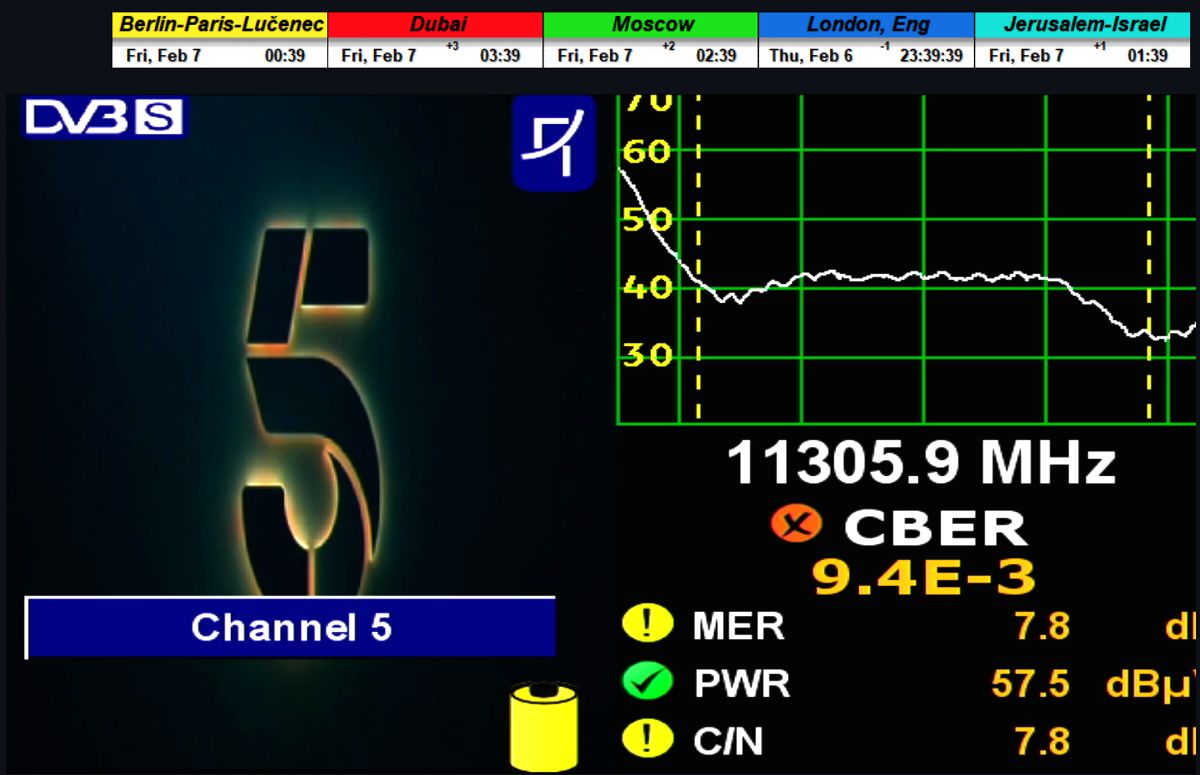 und speziell den Transponder 109 lediglich einen instabilen Lock mit einem SNR von etwa 2,8-3 dB anzeigte. Mit anderen Worten: ein zerfallenes Bild bei dauerhaft instabilem Lock – obwohl der digitale Demodulator im Analysegerät Televes H60 einen völlig stabilen Empfang mit einer Reserve von ca. 2-3 dB meldete, ähnlich wie die stabilen Empfangsergebnisse der Tuner TBS 5925/5927.