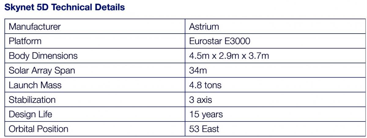aktívnych kanálov) vojenského a geosynchrónneho objektu Skynet 5D,ktorý je poziciovaný nad Indickým oceánom