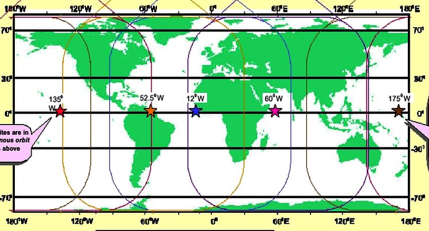 135°W+52.5°W+12W+60°E+175°E,komunikujúcich v L,X,KA ai pásmach a ktorých globálne signálne pokrytie je
